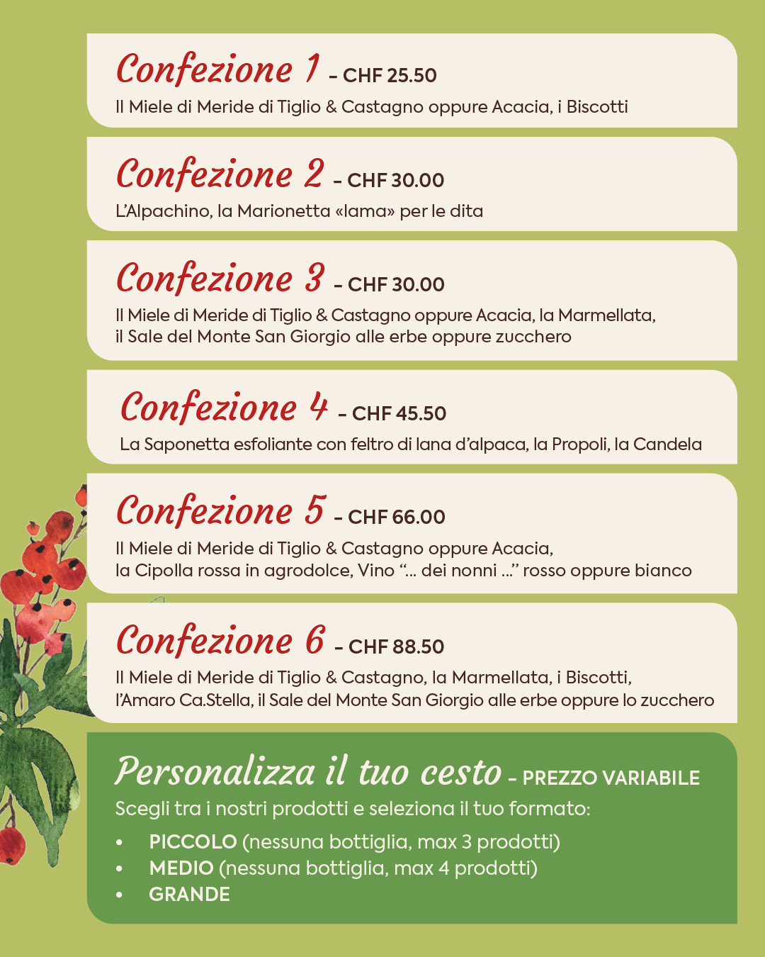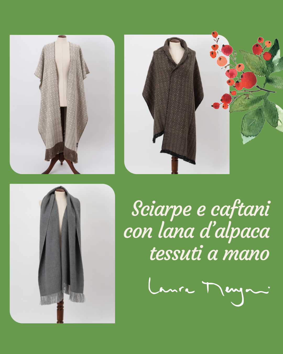 Per rendere unici i vostri regali di Natale abbiamo pensato di proporre diversi cesti, tutti interamente composti con i nostri prodotti naturali, solidali e a km 0. Per un Natale ancora più caldo e prezioso, è possibile acquistare anche le creazioni di Laura Mengani, tessute a mano con la lana dei nostri alpaca.
